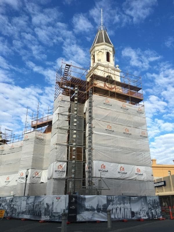 Fremantle Town hall conservation works involved 120 tonnes of scaffold wrapping for the clock tower and entire building. Due to the heritage nature and a client requirement for all windows and doors to be closed, no anchors to the façade nor through window ties were allowed, resulting in reveal ties and buttress solutions. The rear of the clock tower’s lower non-load bearing roof had 10 levels (20 vertical metres) of scaffold above it that required support from either side of the 12m span. Paragon solved this challenge with Layher Allround Lattice beams and braces. Despite the complexities and the forces of Fremantle Doctor for 11 months, the scaffold stood the test of time without incident. A true testament to our skilled tradesman, quality engineering, thorough regular scaffold inspections and plenty of zip ties on the shade cloth.